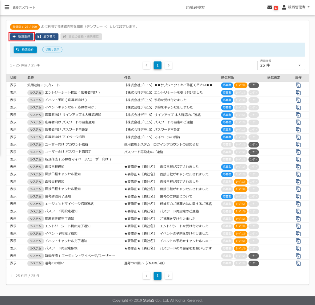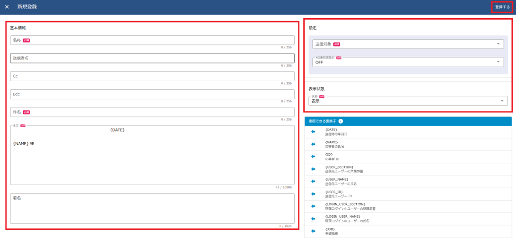 メール送信やメール一括送信の際、テンプレートリストへの【表示/非表示】を設定します。