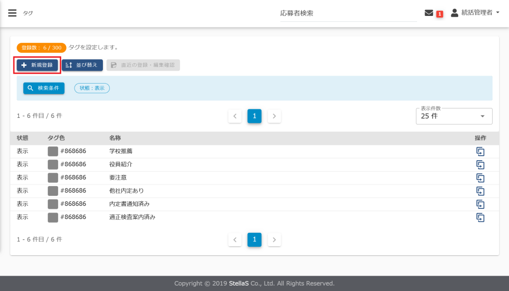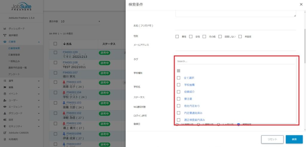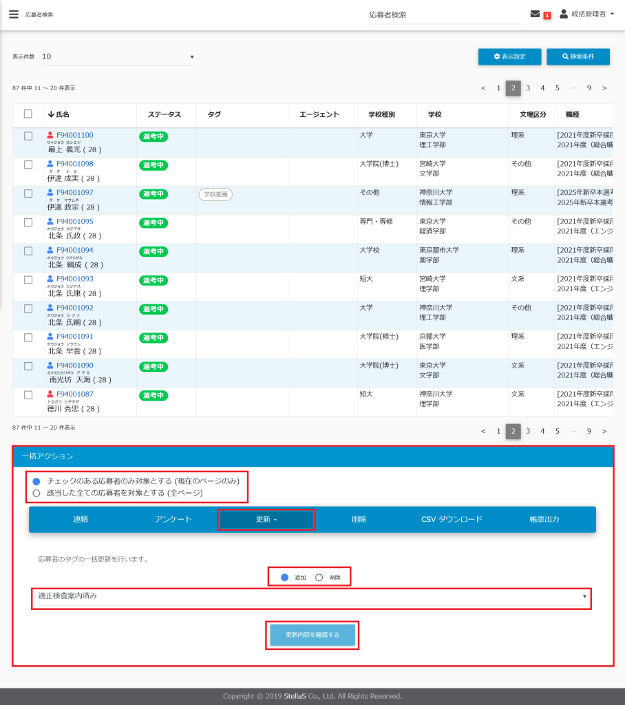 「応募者検索」画面より応募者へタグを一括更新することができます。