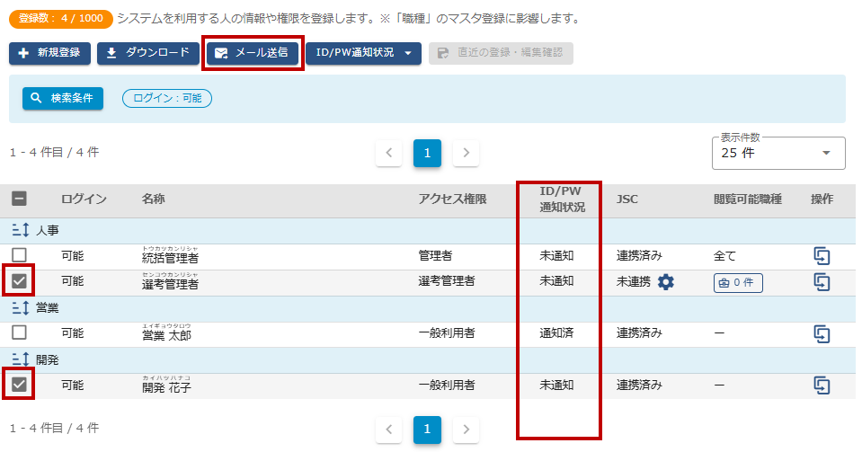 (8)ユーザーにID/PWメールが通知され「ID/PW通知状況」が”通知済み”に変更されます。